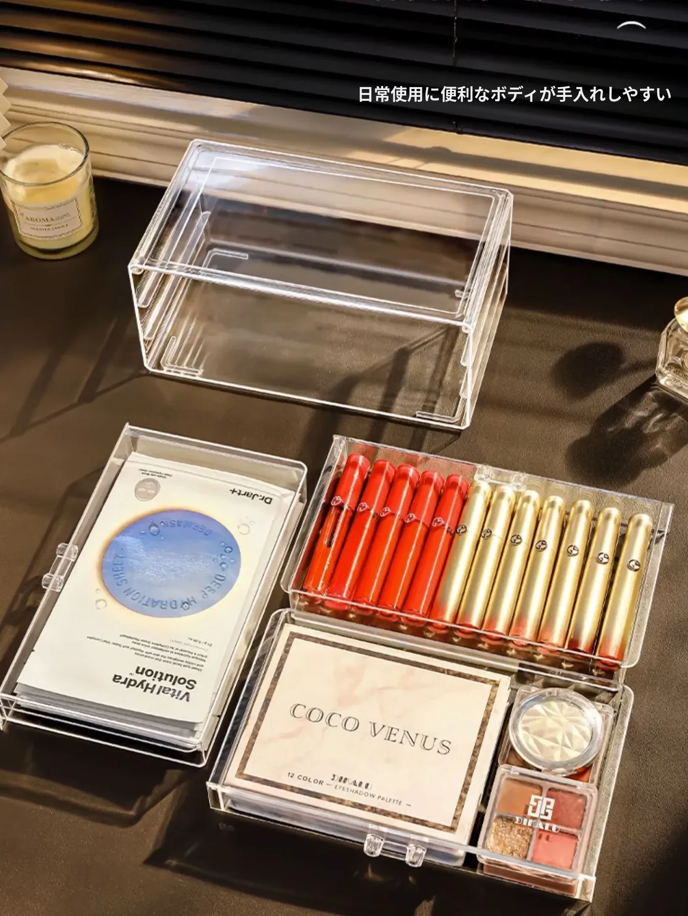 人気の透明防塵コスメ収納ボックス!アクリル製で美しいスキンケアアイテムやフェイスマスクをおしゃれに整理。メイク台やデスクの必需品、あなたの毎日を便利に彩ります。