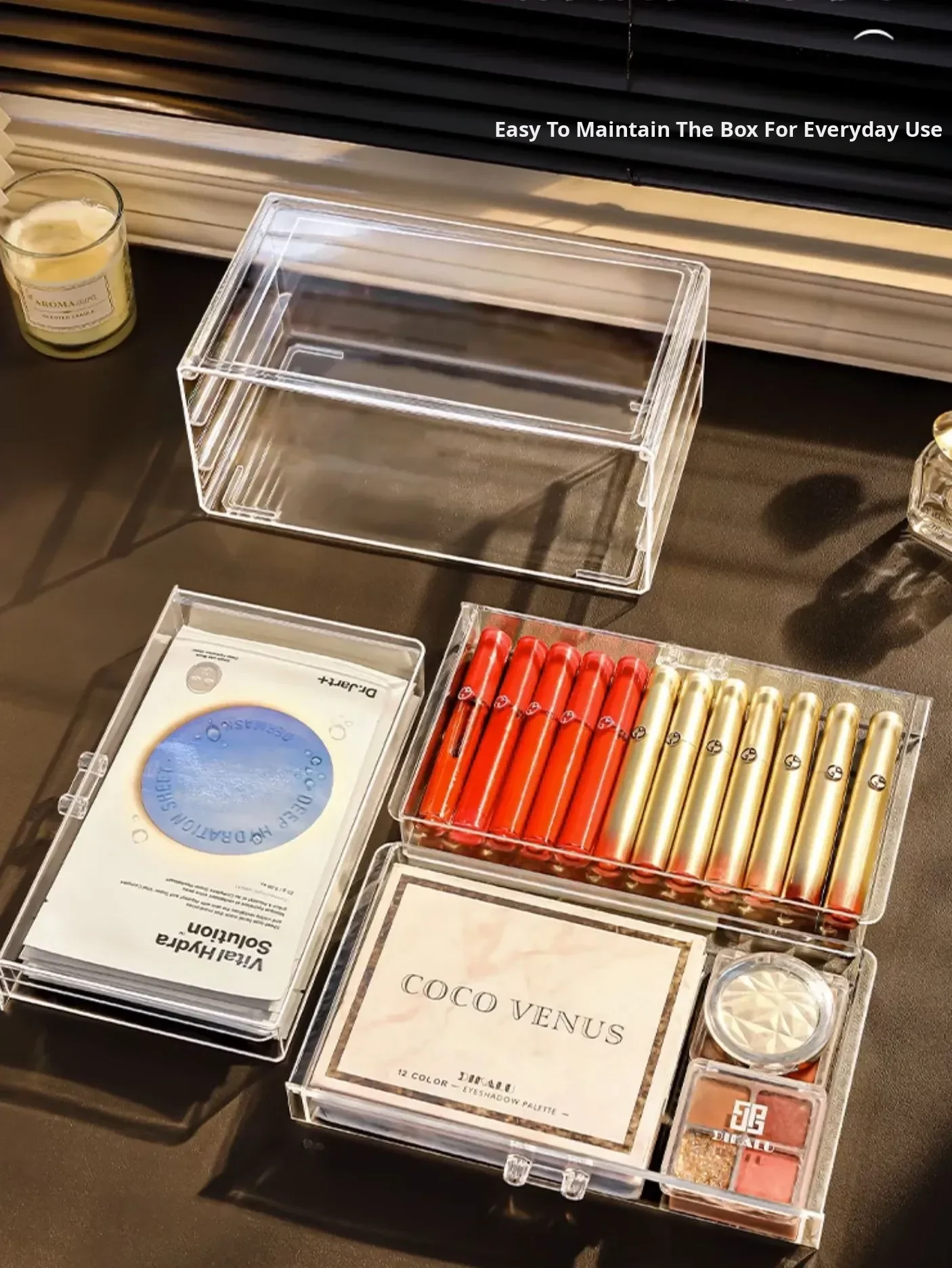 Acrylic Makeup Organizer with Dustproof Lid - Transparent Cosmetic Storage Box for Skincare and Face Masks - Stylish Vanity Desktop Display Unit