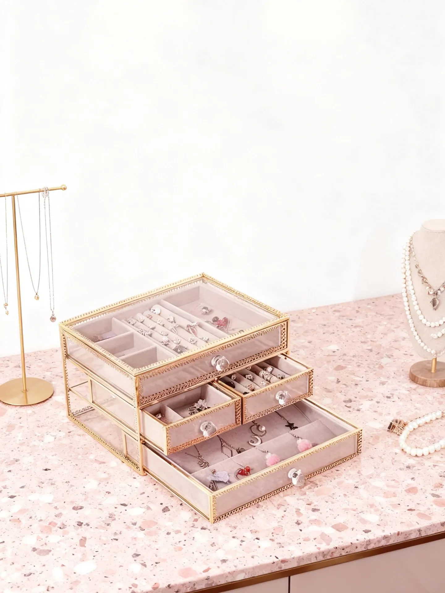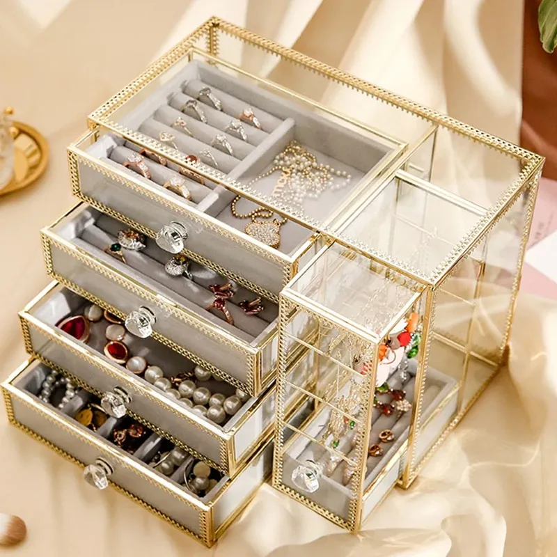 Vintage Chic Makeup Organizer Box - Elegant Glass Jewelry Storage for Earrings, Rings, Necklaces & Clips - Stylish Dust-Proof Display for Your Desktop Accessories