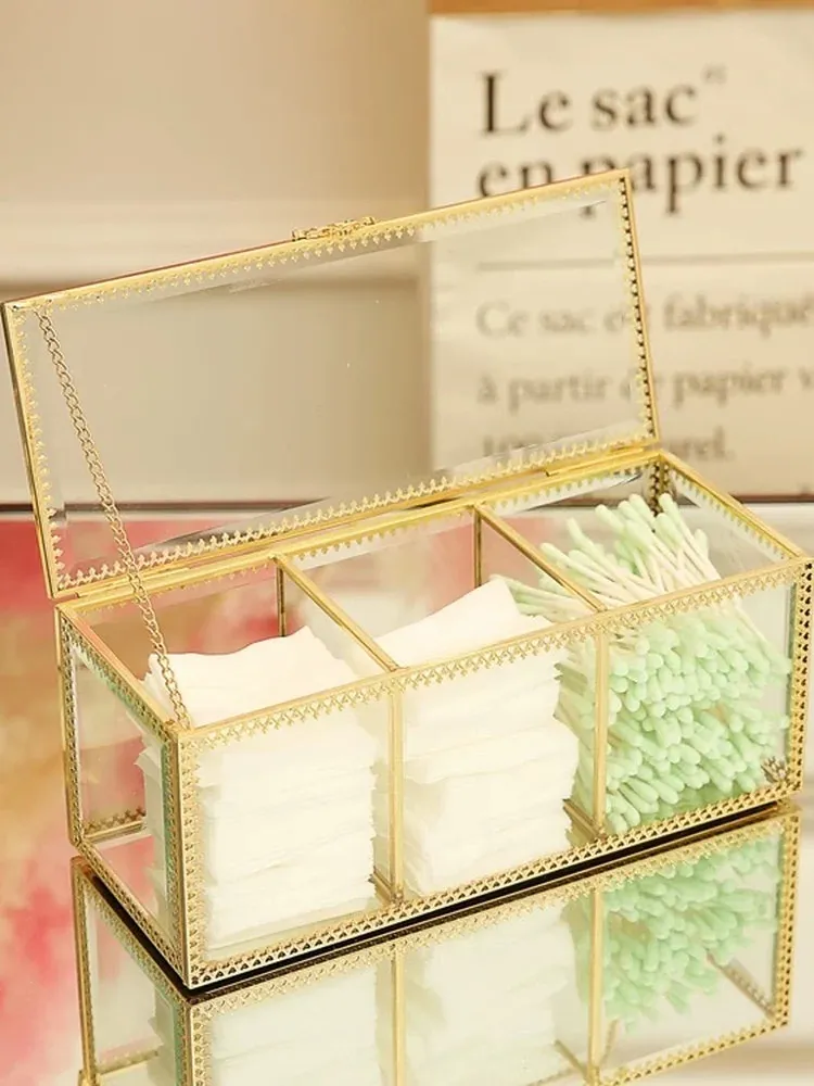 Versatile Makeup Organizer - Dustproof Transparent Storage Box with Elegant Gold Edges, Vintage European Style Metal Mirrored Cotton Swab Holder