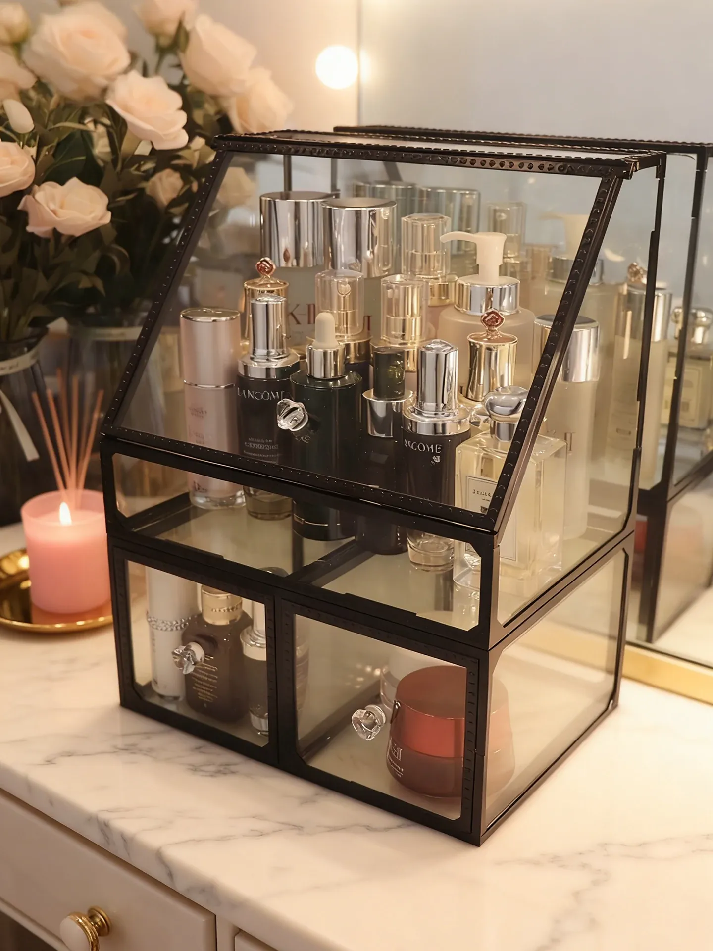 Elegant Glass Makeup Organizer – Chic Vanity Storage for Skincare, Perfumes, and Lipsticks – Clear, Dust-Proof Design for a Luxurious Touch