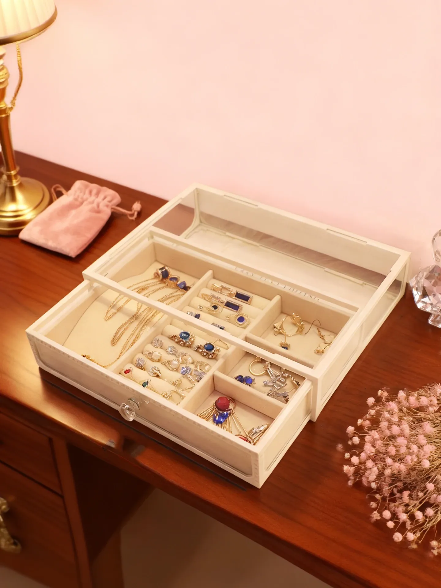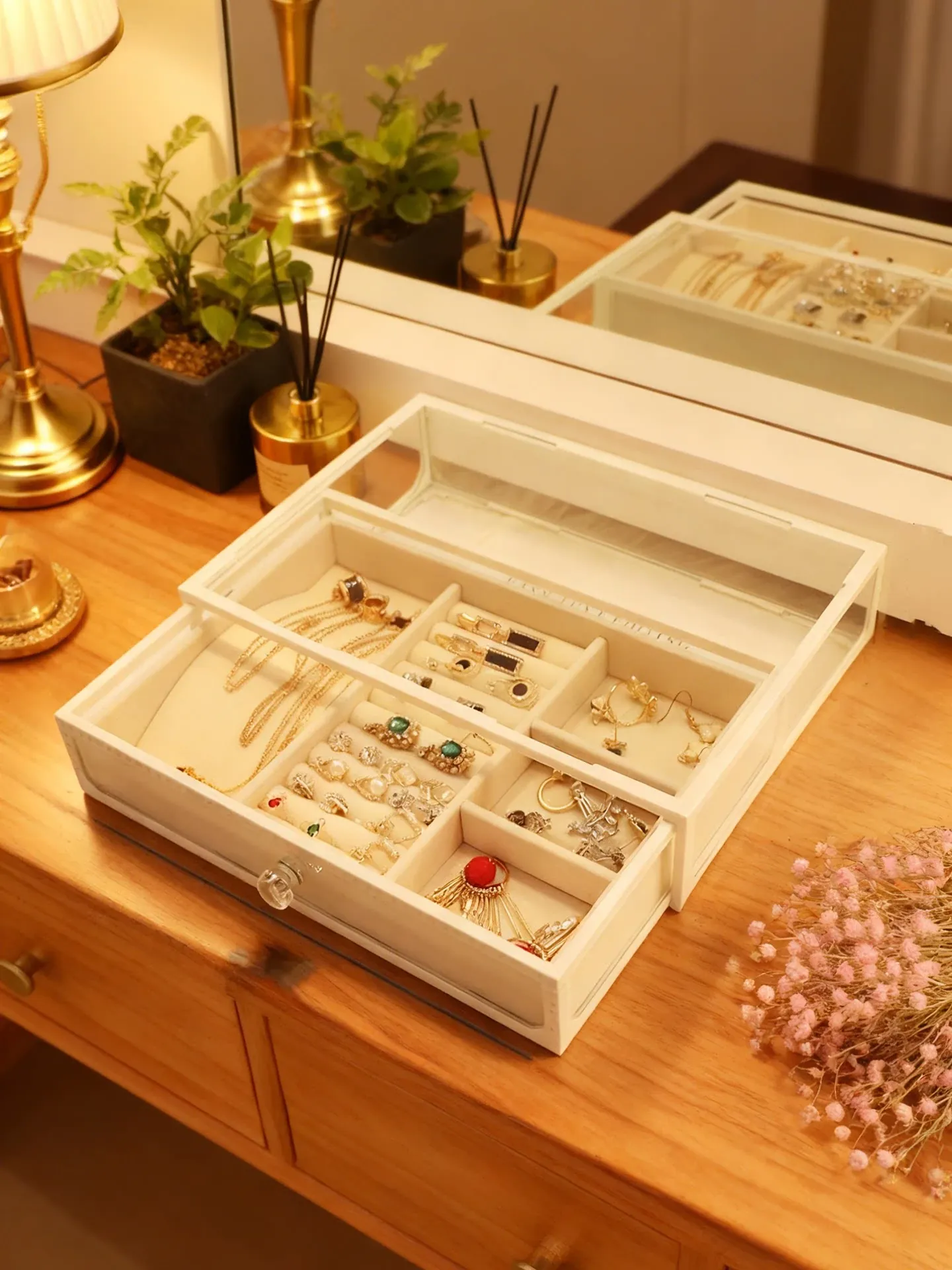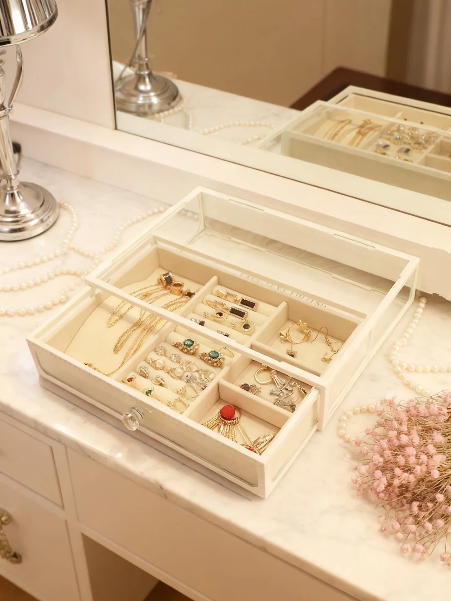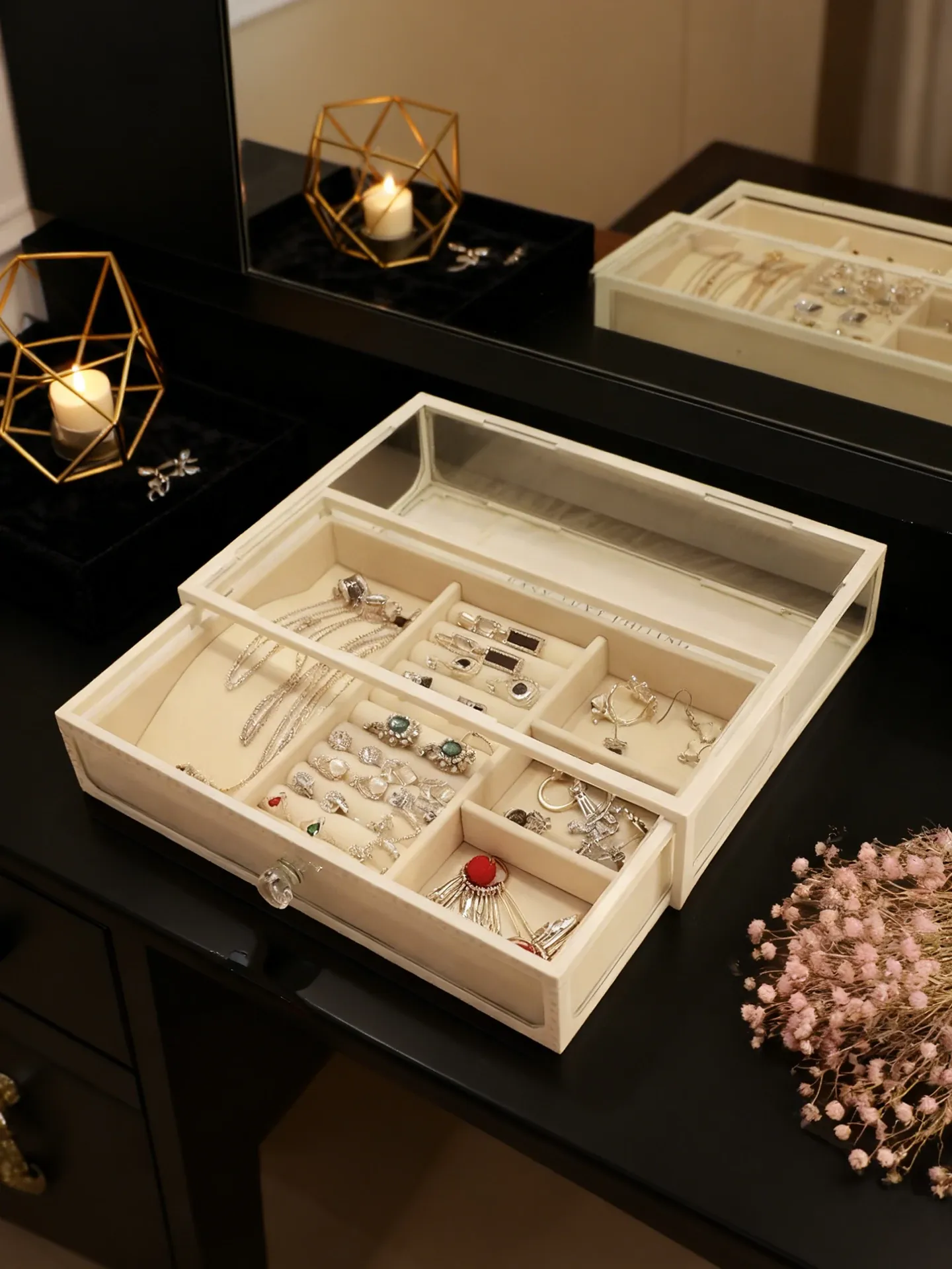 Elegant Glass Jewelry Box - Transparent Dustproof Storage Organizer for Vanity, Perfect for Skincare Products and Accessories, Ideal for Home Use