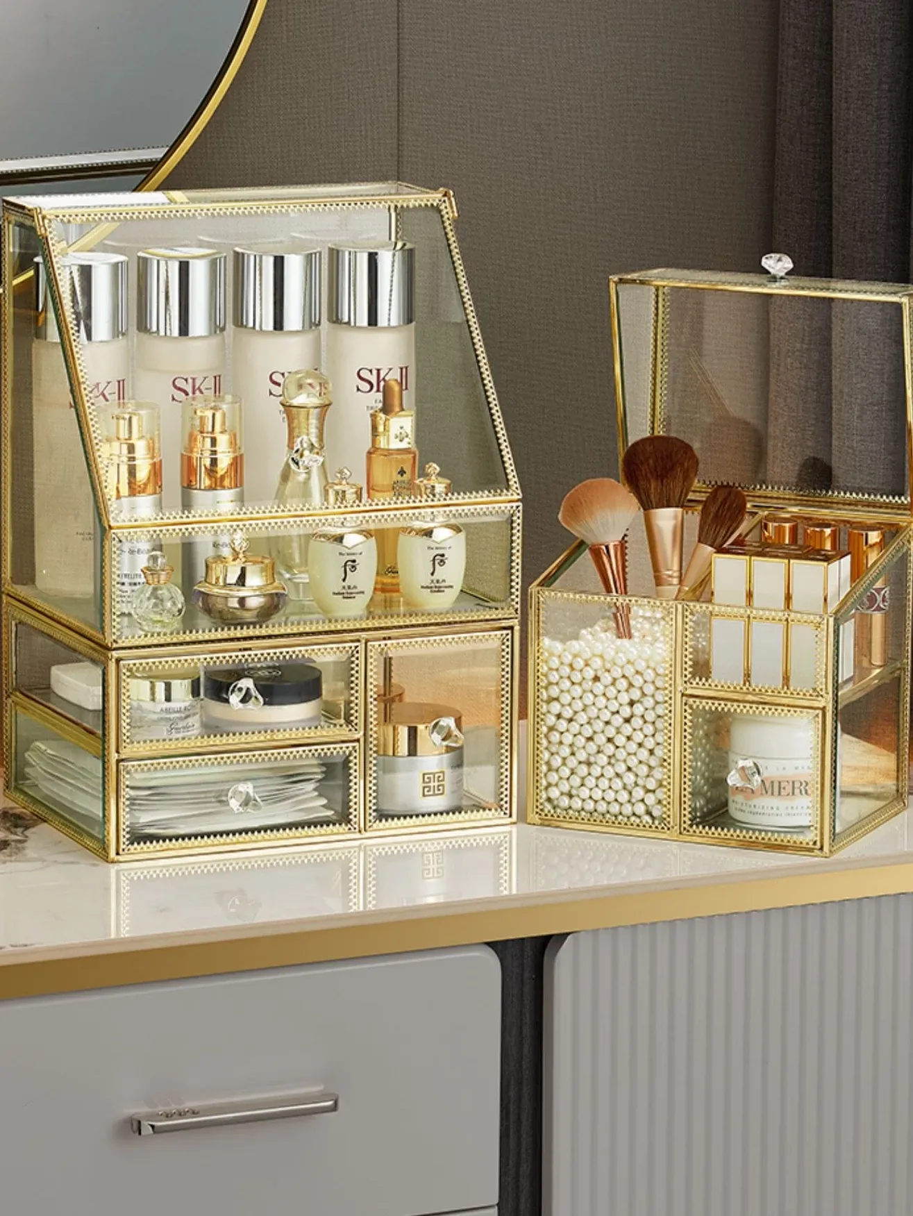 Stylish Tempered Glass Makeup Organizer - Trendy Drawer Storage for Home Vanity, Perfect for Skincare and Cosmetics!