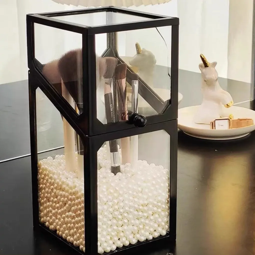 Elegant Makeup Brush Organizer with Dustproof Lid - Portable Glass Vanity Box for Eyebrow Pencils and Brushes, Perfect for Your Chic Desktop Display