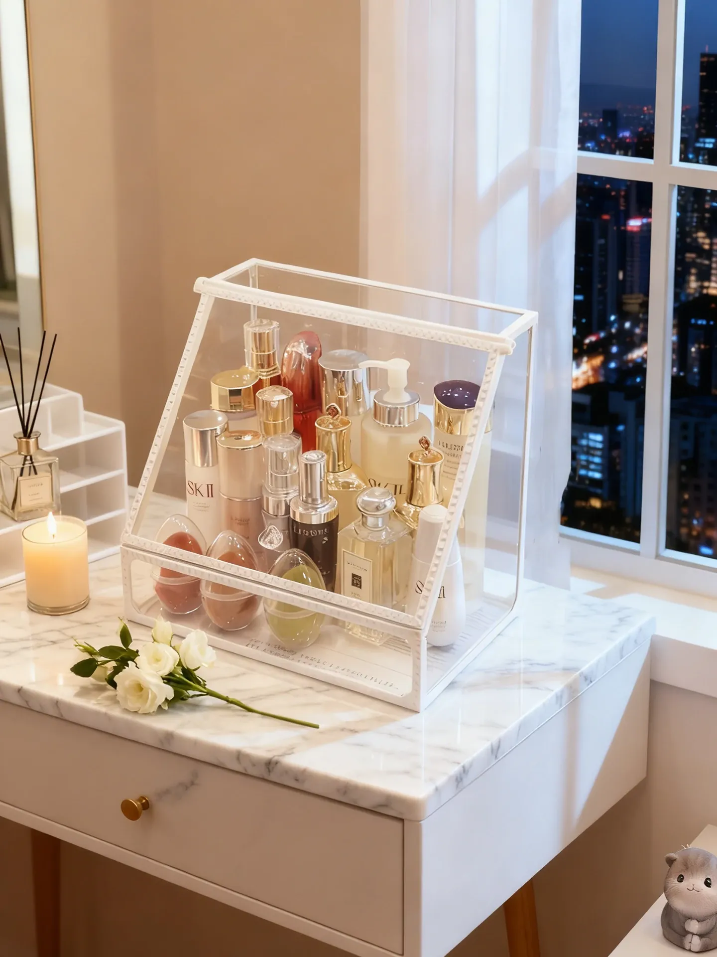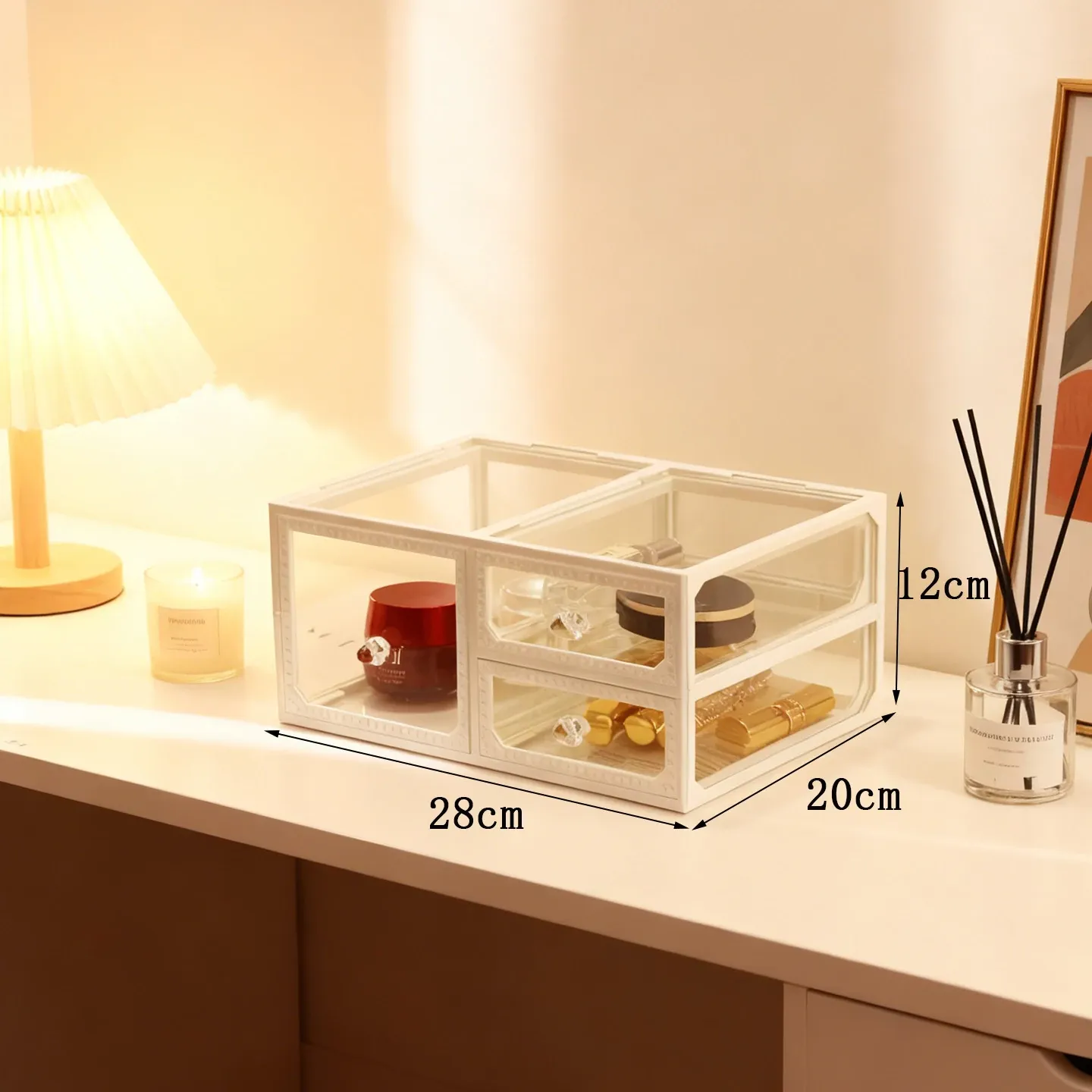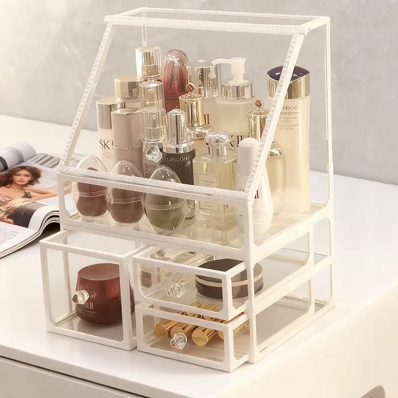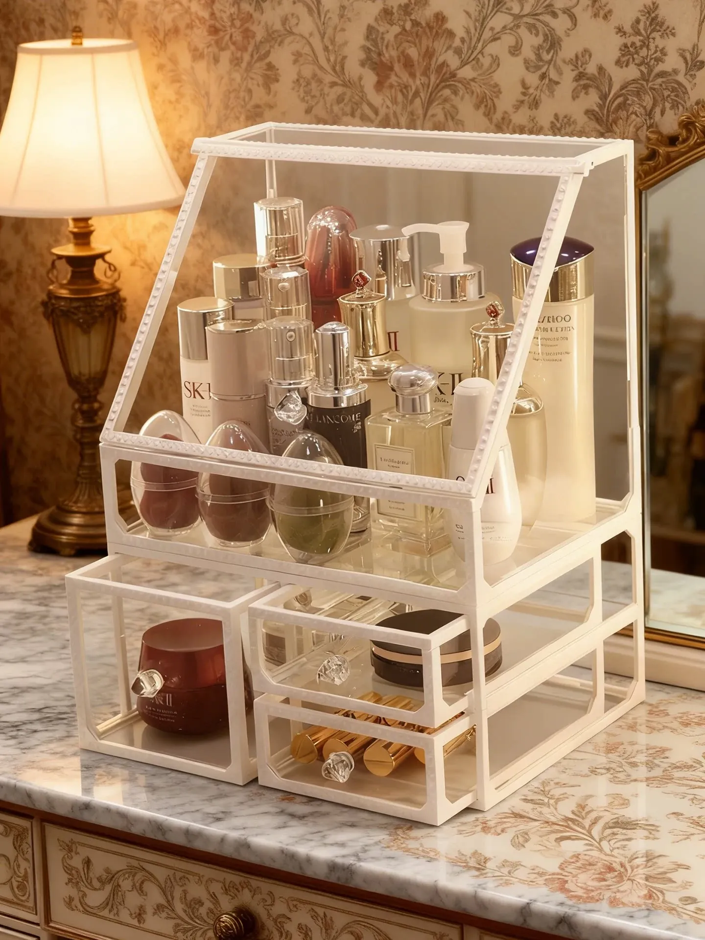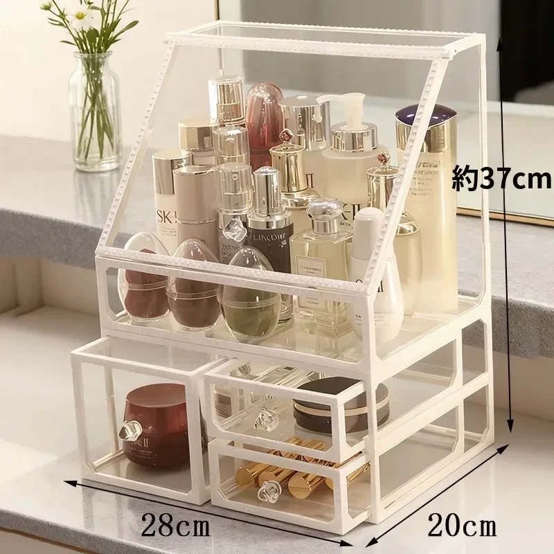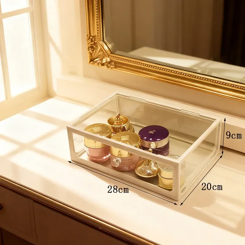 おしゃれな欧州スタイルのデスク用化粧品収納ボックス!透明ガラス仕上げで、メイクアップを美しく整理整頓。ホワイトの置物ラックで、洗練された雰囲気を演出。あなたのビューティーアイテムを引き立てる完璧な整理整頓アイテムです!