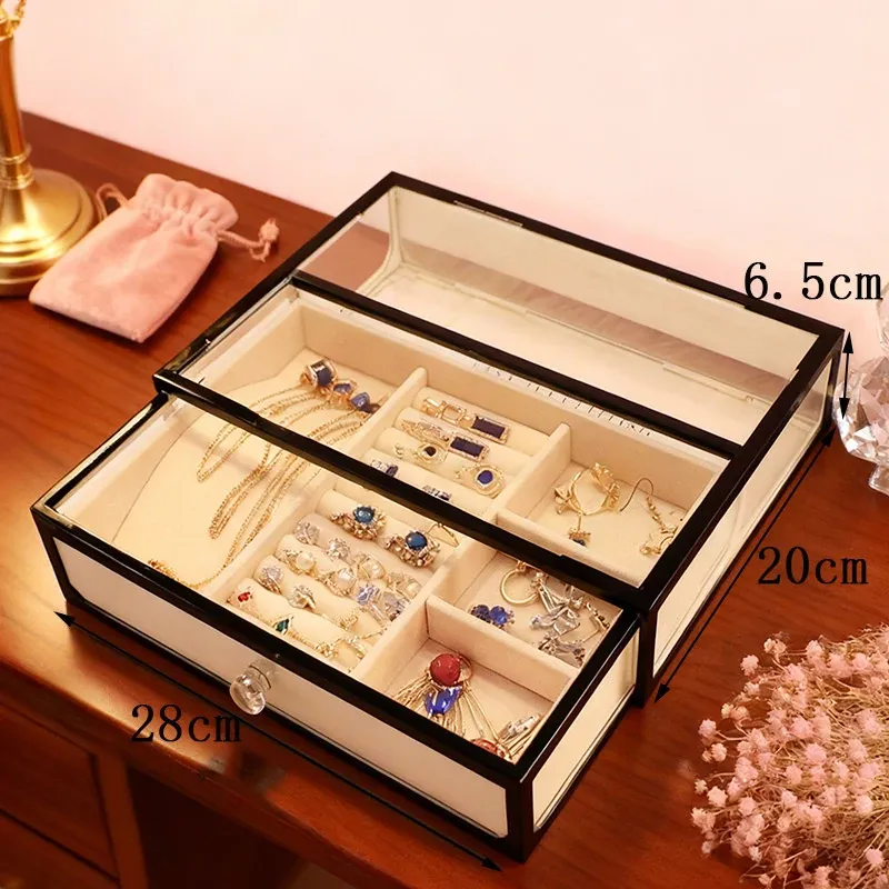 高級感あふれるガラス製ジュエリーボックス - 透明で防塵、デスクトップに最適な収納スペース。化粧台やスキンケア用品、アクセサリーを美しく整理!あなたのインテリアを引き立てるアイテム!