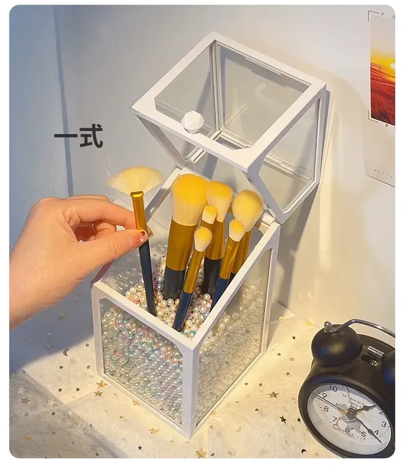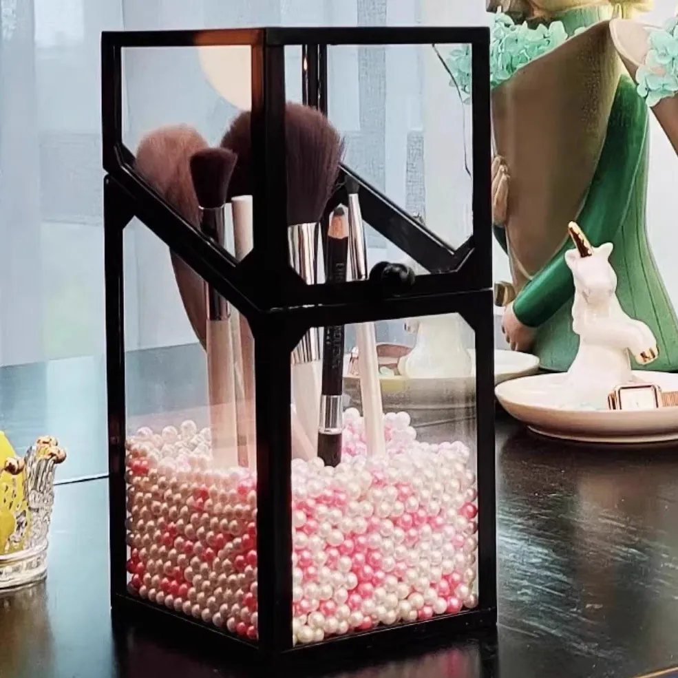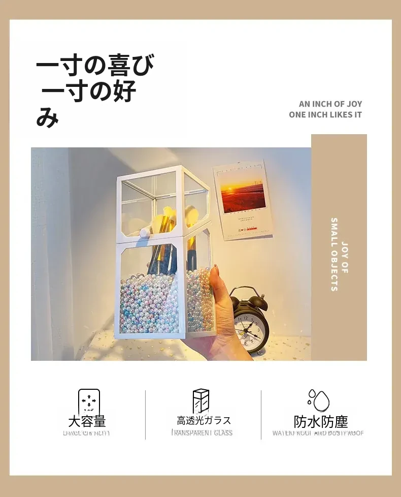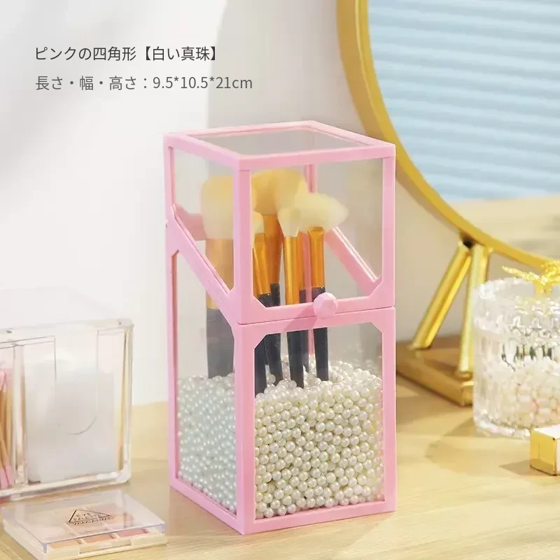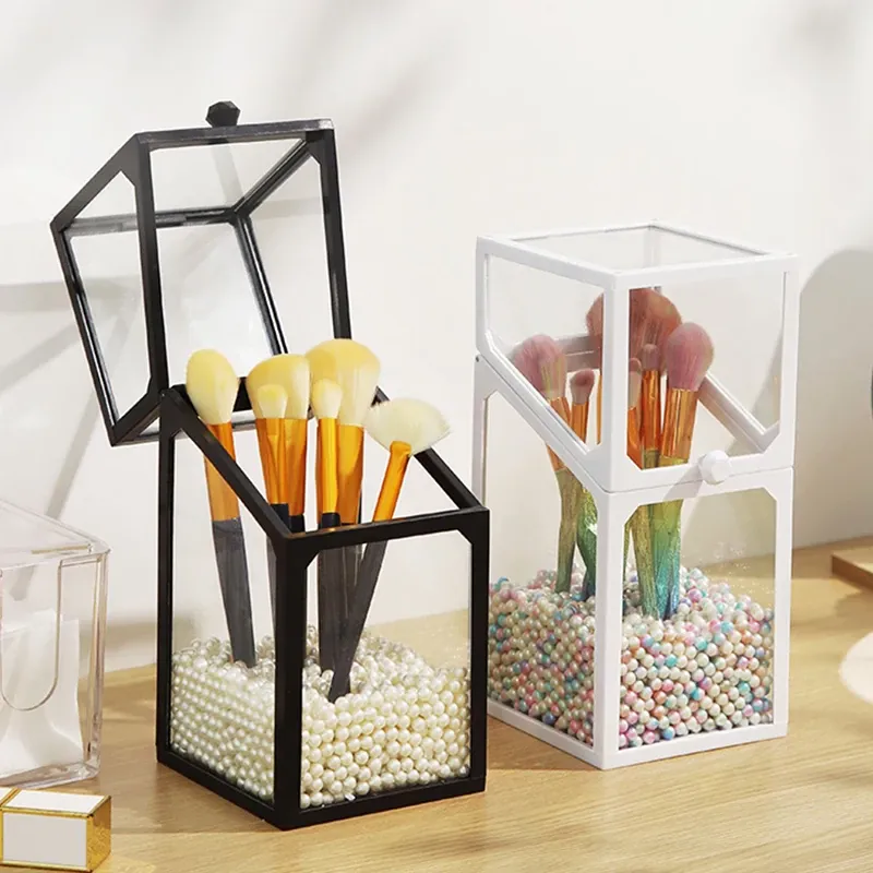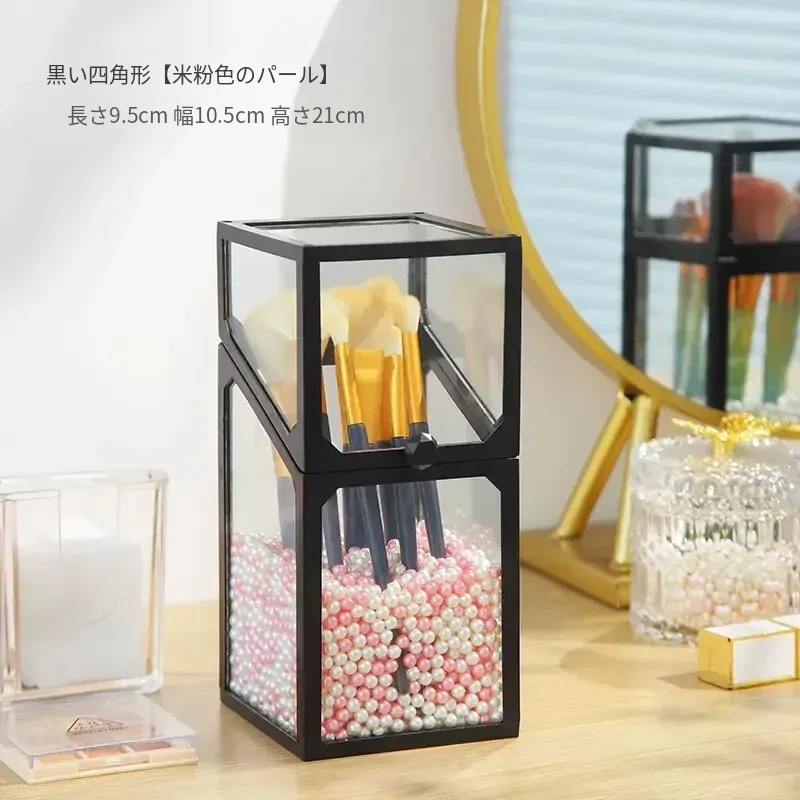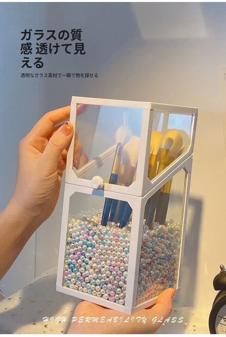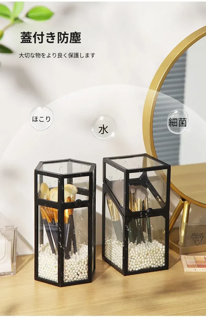 高級感あふれる化粧ブラシ収納筒 - 防塵カバー付きガラス製、持ち運び便利なデスク用メイクボックス。おしゃれなインスタ風のアイブロウペンシル&ブラシ用バケットで、あなたの美容道具をスタイリッシュに整理!