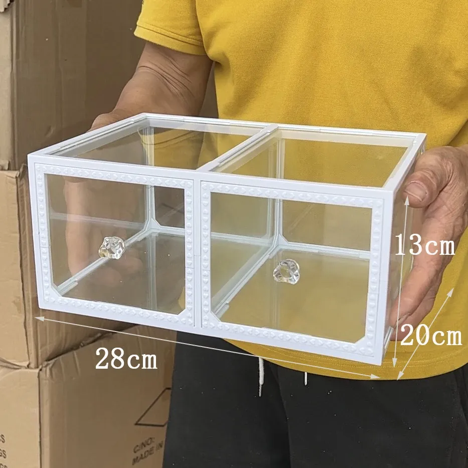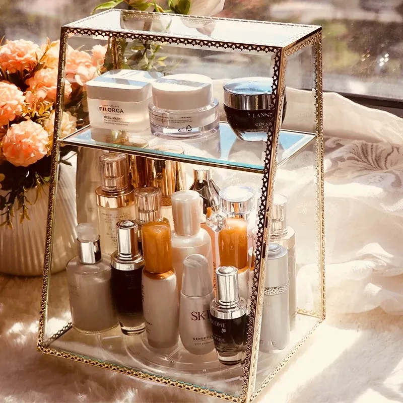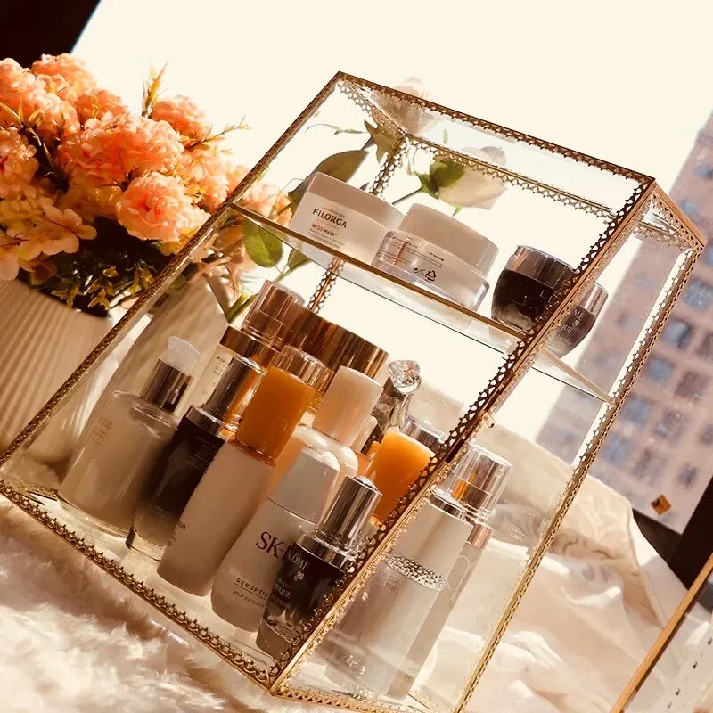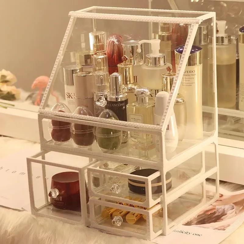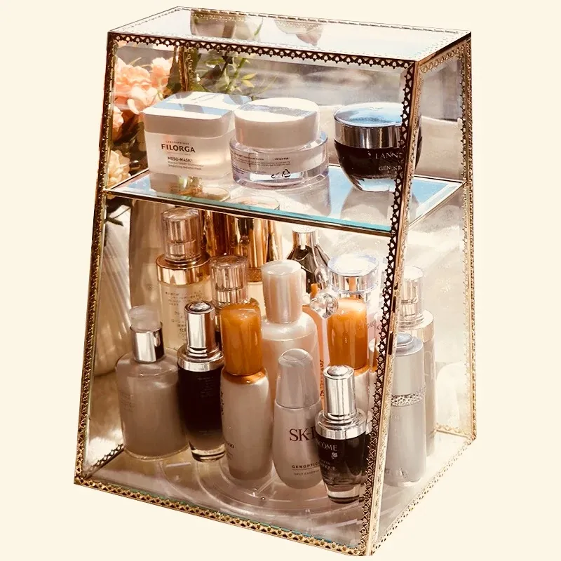 透明でスタイリッシュなサイドオープン大容量メイクアップコスメ収納ボックス - おしゃれなドレッサー整理ボックス、スキンケア製品もすっきり収納できるガラス製の蓋付きディスプレイラック!