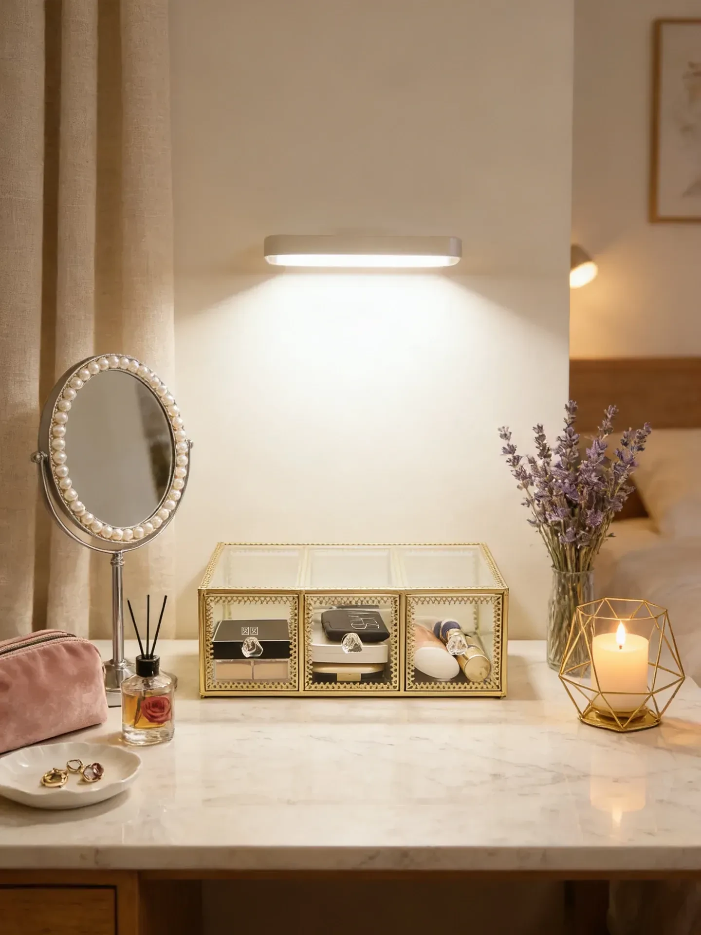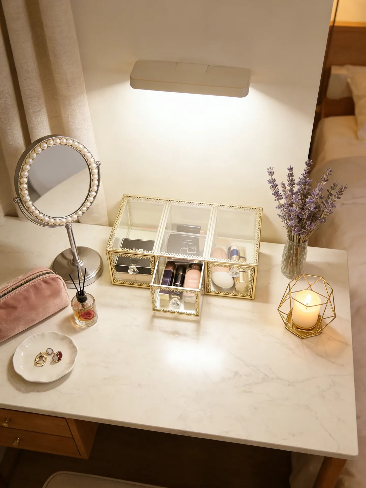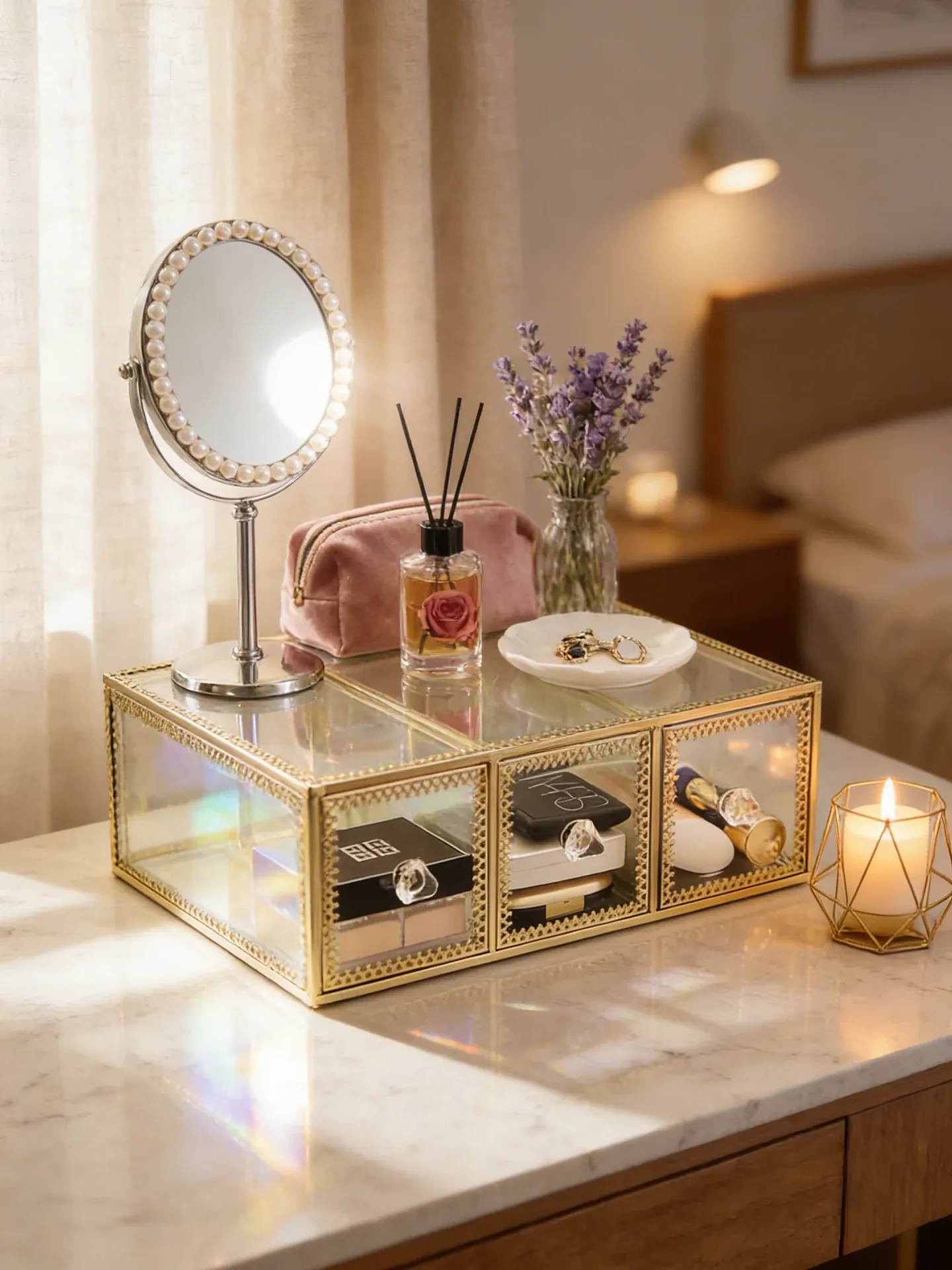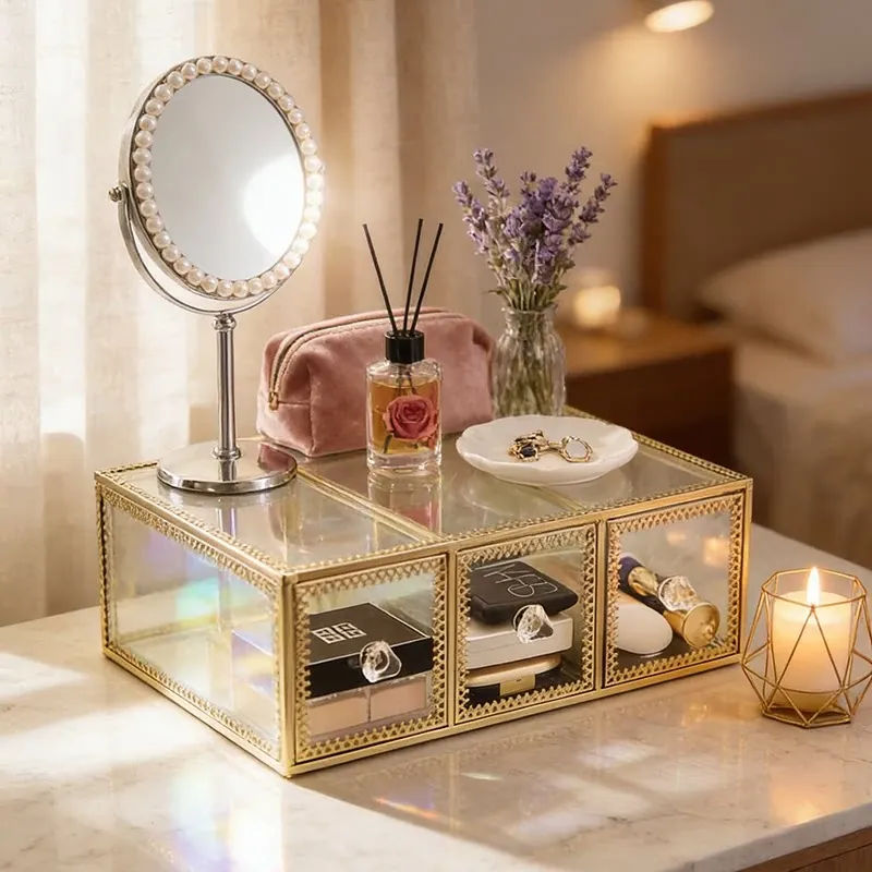 高級ゴールドガラス化粧品収納ボックス - 防塵設計のスキンケアアイテム用デスクトップ整理棚!美しい化粧台を作り上げ、毎日のビューティータイムをもっと特別に!
