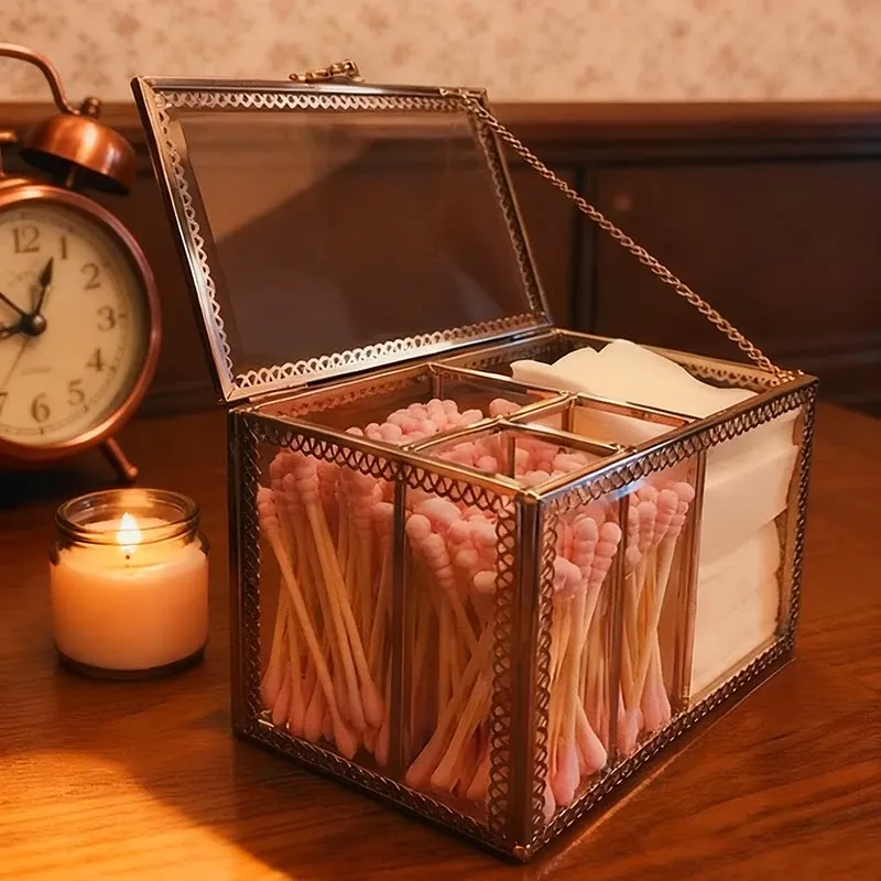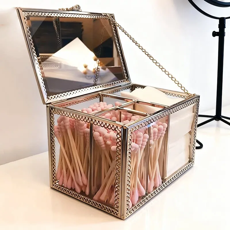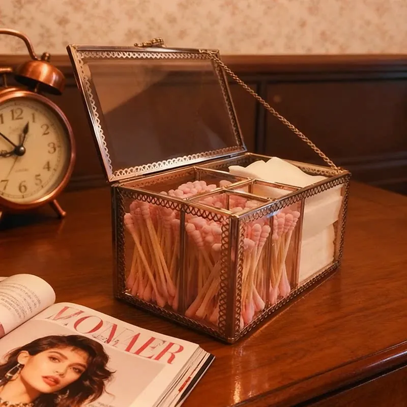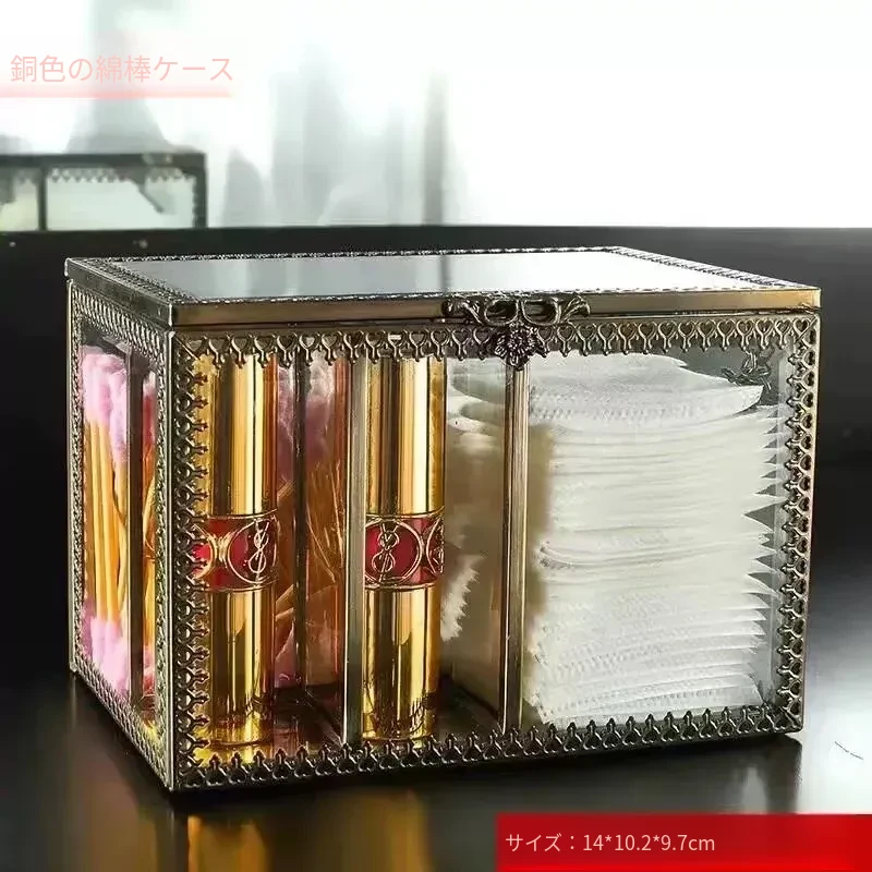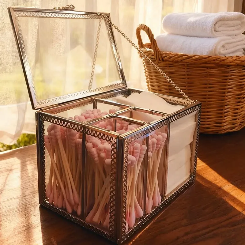 ラグジュアリーなプラチナガラス製の防塵化粧綿収納ボックス - 透明デザインで洗練されたメイク台を演出!綿棒整理も簡単に。おしゃれで機能的なデスクトップ収納アイテム!