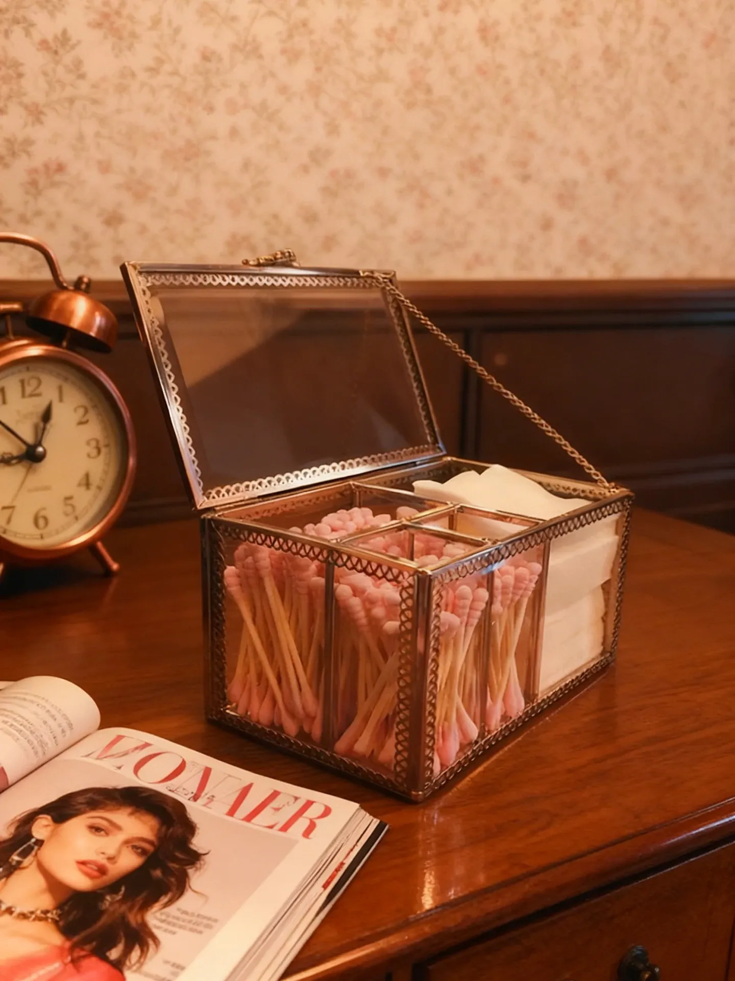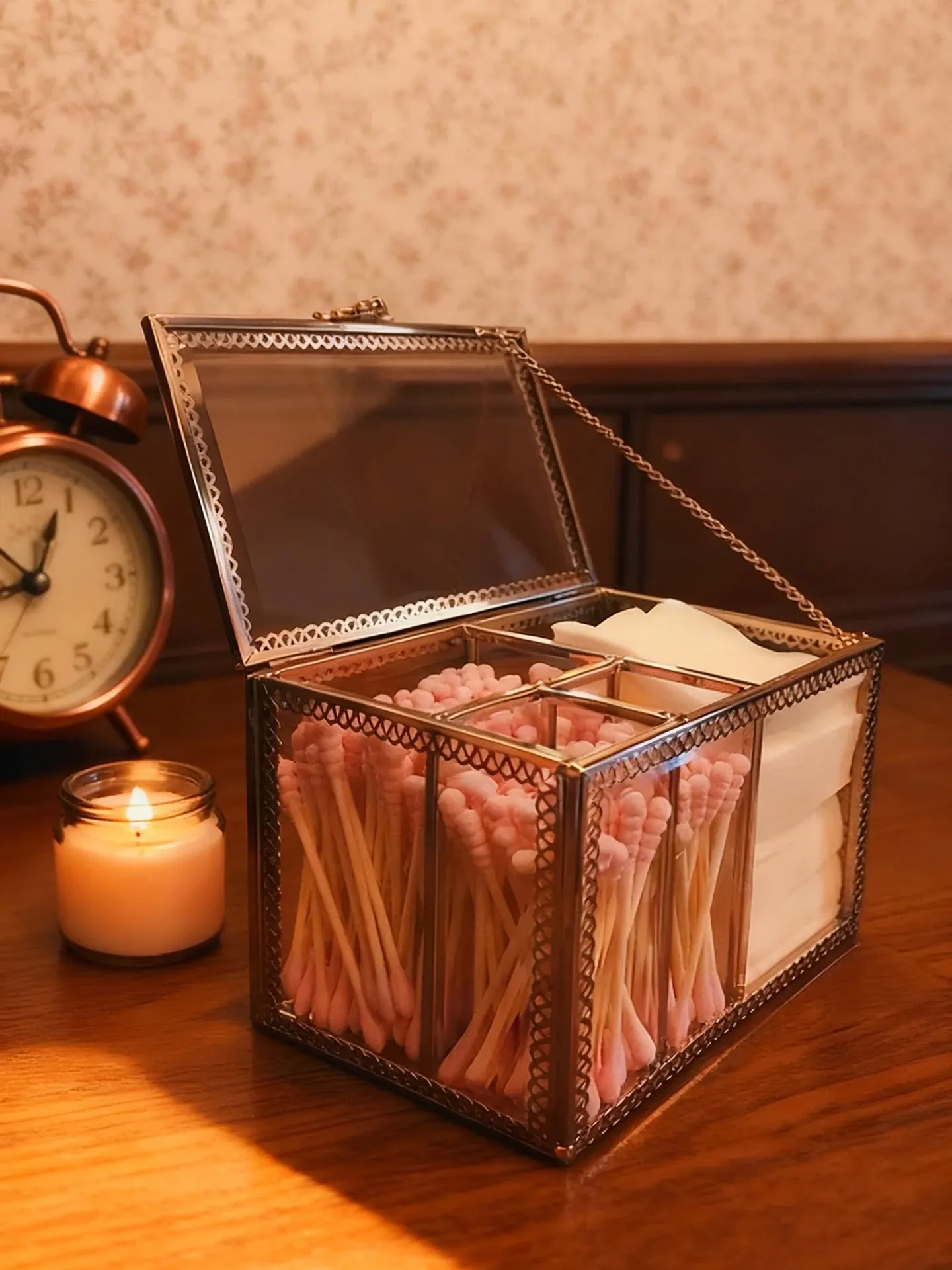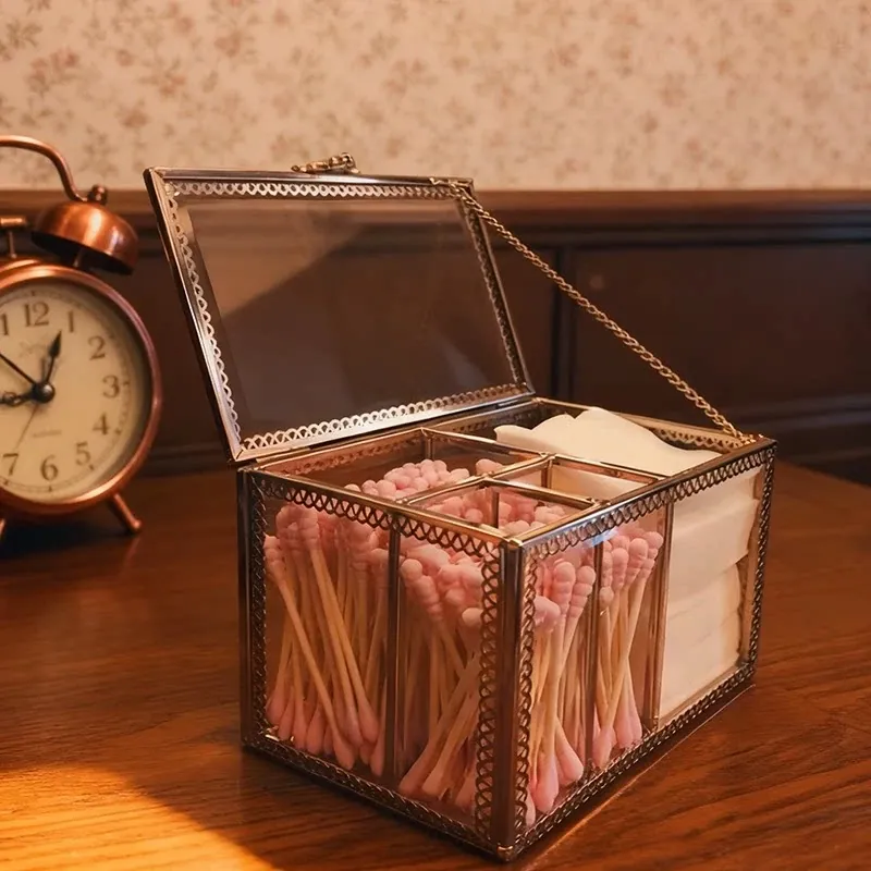 ラグジュアリーなプラチナガラス製の防塵化粧綿収納ボックス - 透明デザインで洗練されたメイク台を演出!綿棒整理も簡単に。おしゃれで機能的なデスクトップ収納アイテム!