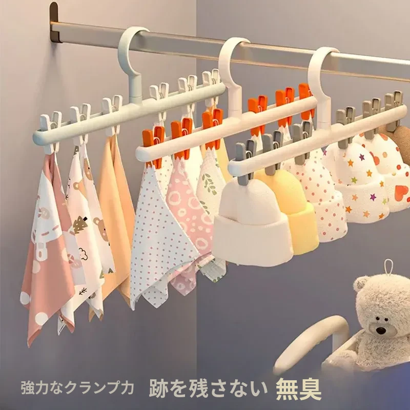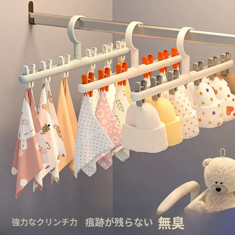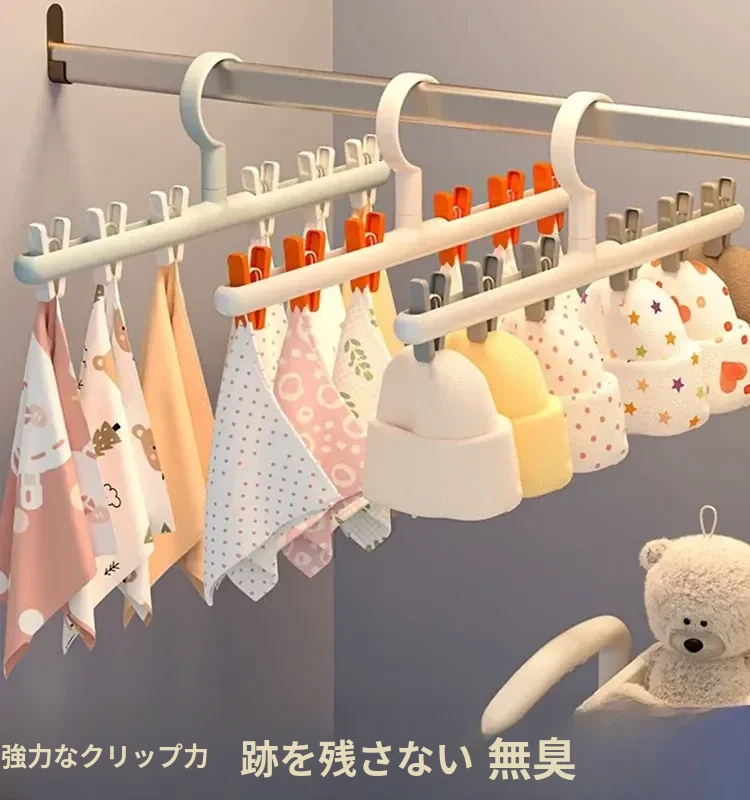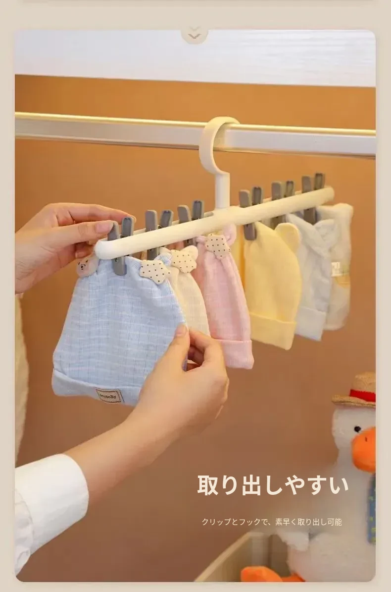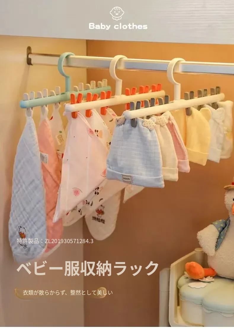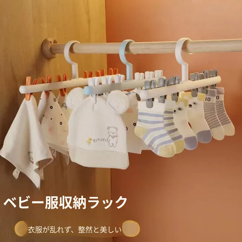 赤ちゃん用ハンガー 多機能クリップ付き 服やおむつ、タオル、帽子、靴下、下着をすっきり整理!おしゃれで便利な収納ラックで、育児をもっと楽に!