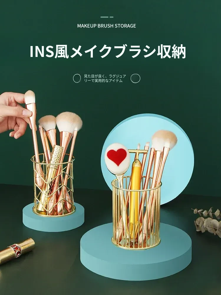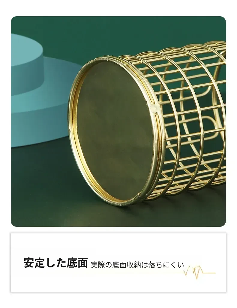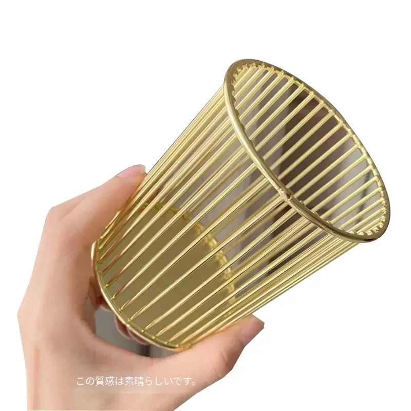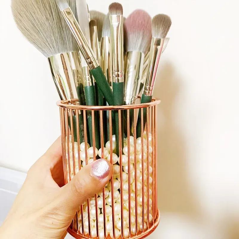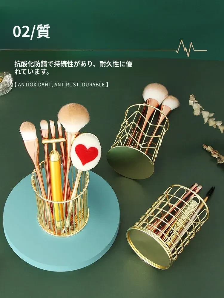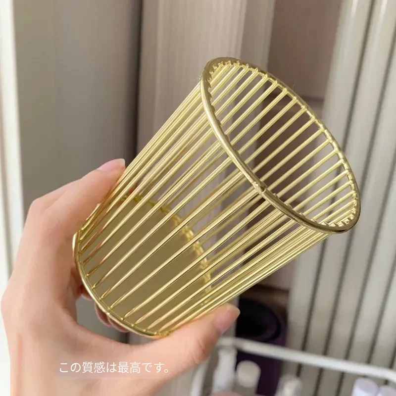 学生向けデスク用メイクブラシ収納バケツ - おしゃれな北欧風のアイアン製ゴールドペンスタンド!化粧品の整理整頓に最適で、埃から守る優れたデザイン。あなたのデスクを美しく彩ります!