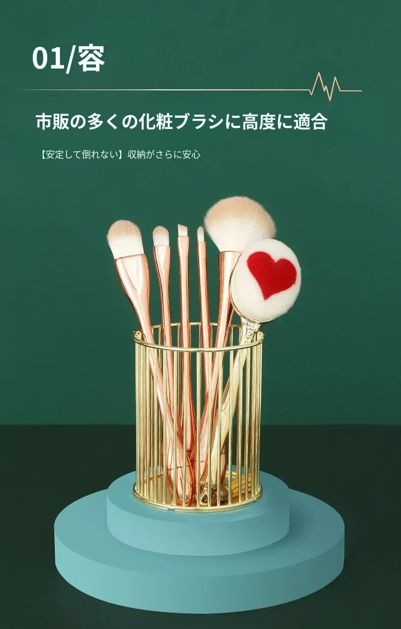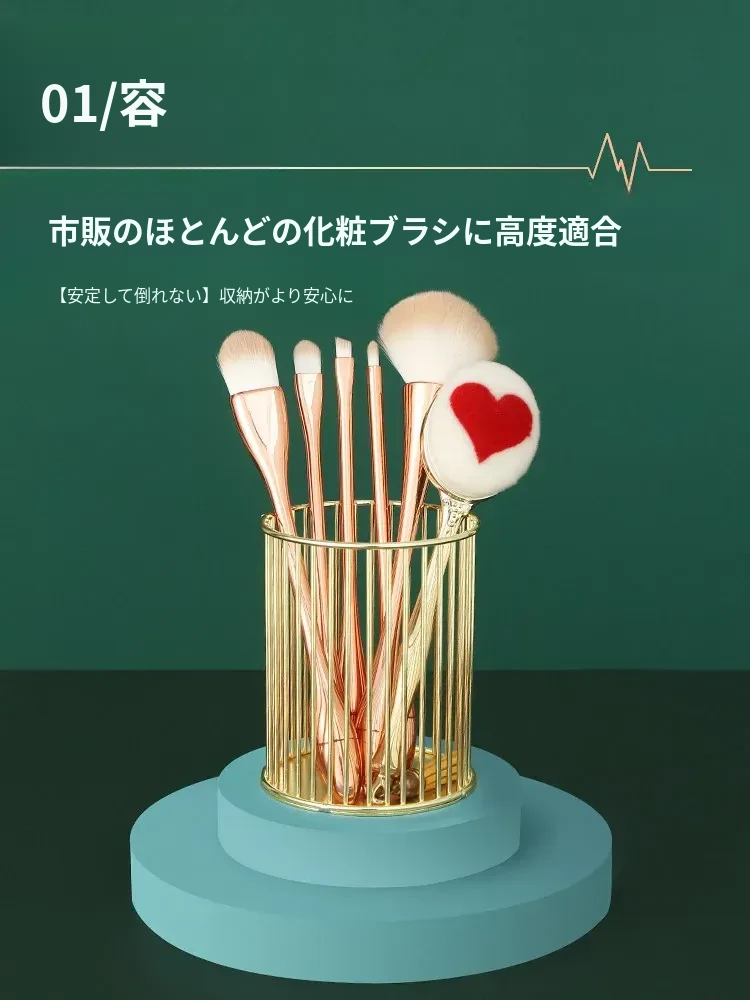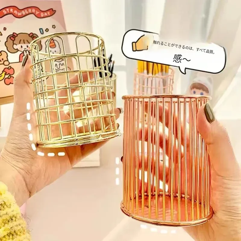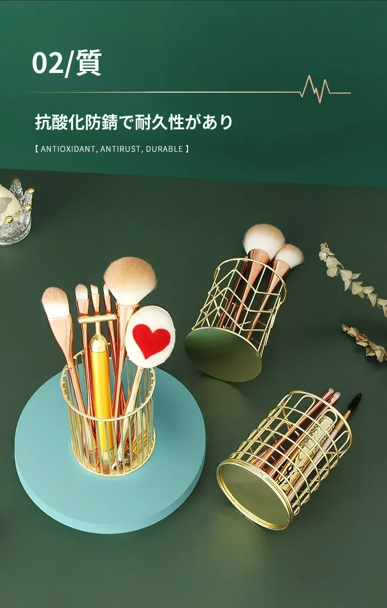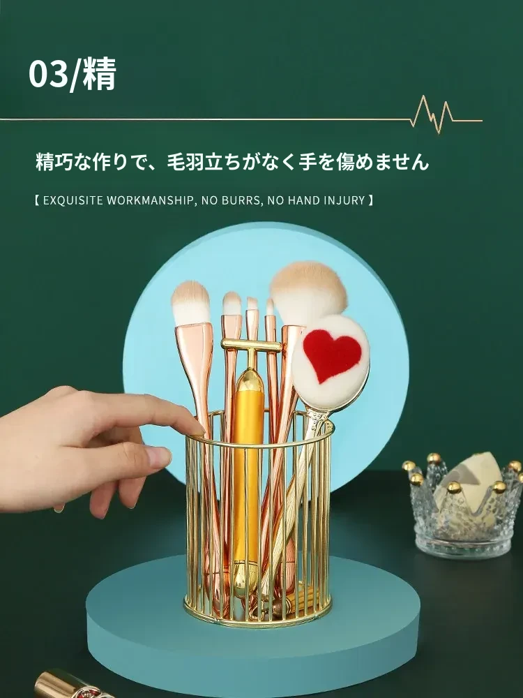 学生向けデスク用メイクブラシ収納バケツ - おしゃれな北欧風のアイアン製ゴールドペンスタンド!化粧品の整理整頓に最適で、埃から守る優れたデザイン。あなたのデスクを美しく彩ります!