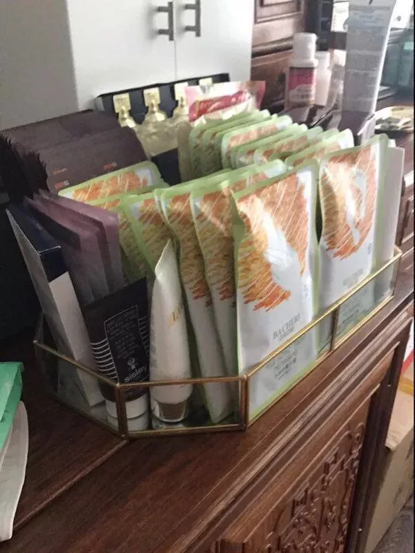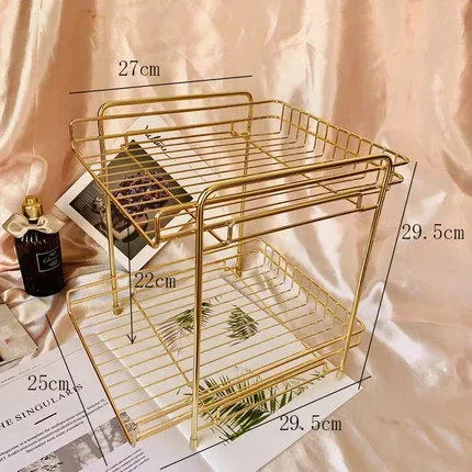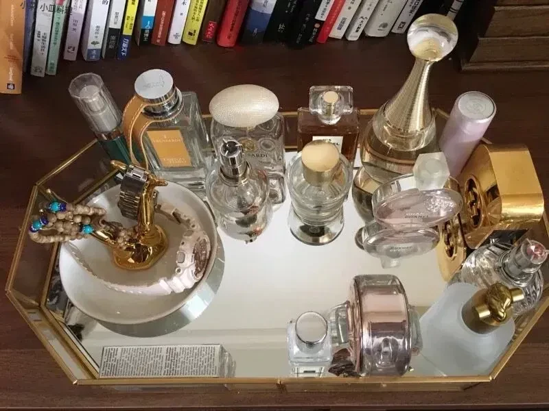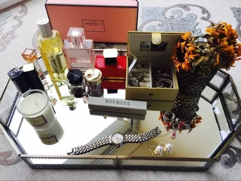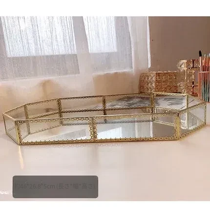 シンプルでモダンな欧米スタイルの化粧品収納ボックス|金属ガラス製ミラートレイ|ゴールドの収納とメイク台に最適なフェイスマスクスタンド!おしゃれで機能的な収納で、あなたの美容空間をグレードアップ!