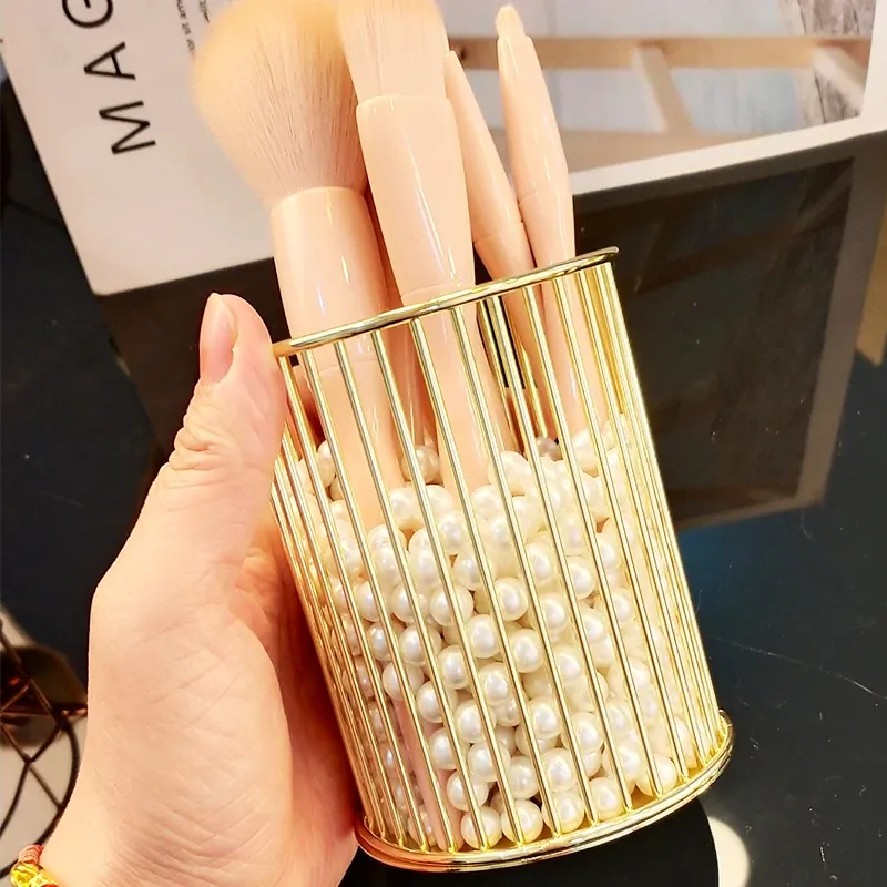 インスタ風北欧スタイルのメイクブラシ収納バケツ!おしゃれなアイアン製で、化粧品や美妆ツールをスタイリッシュに整理。ゴールドのペンバケツで、あなたのメイクスペースを華やかに!